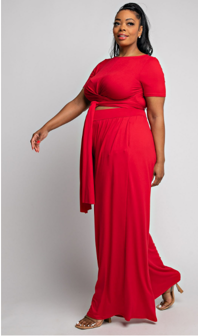 PLUS SIZE WRAP AROUND SHORT SLEEVE TOP AND PALAZZO PANTS SET