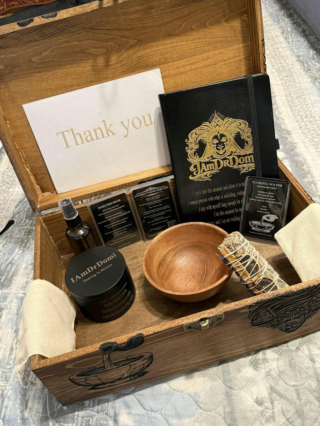 🪡 Add your name, meaningful affirmations, or special symbols to the box, journal, candle, or pen.