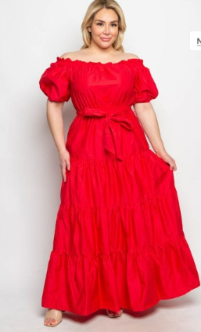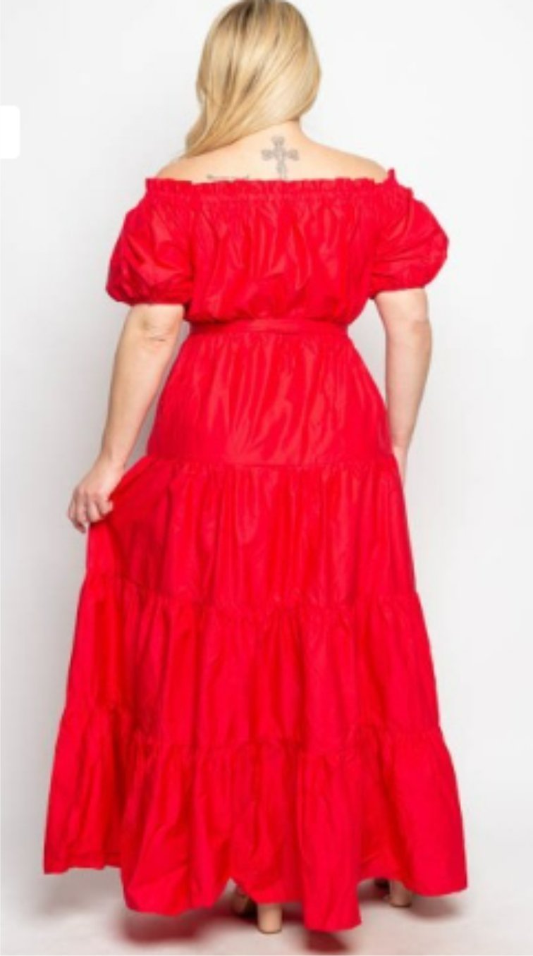 A solid poplin maxi dress featuring off shoulder neckline, short sleeve, elasticized waist with self sash tie and tiered skirt.