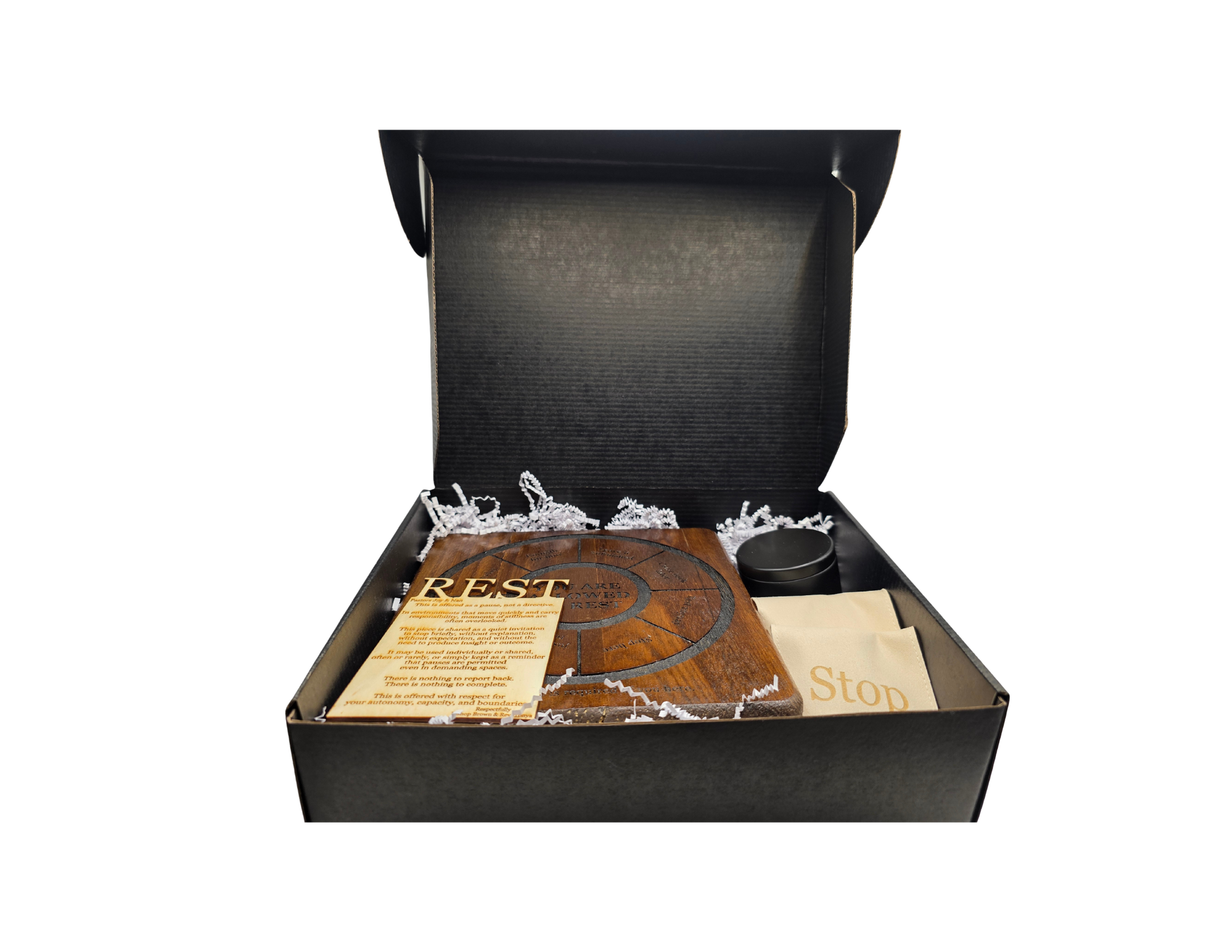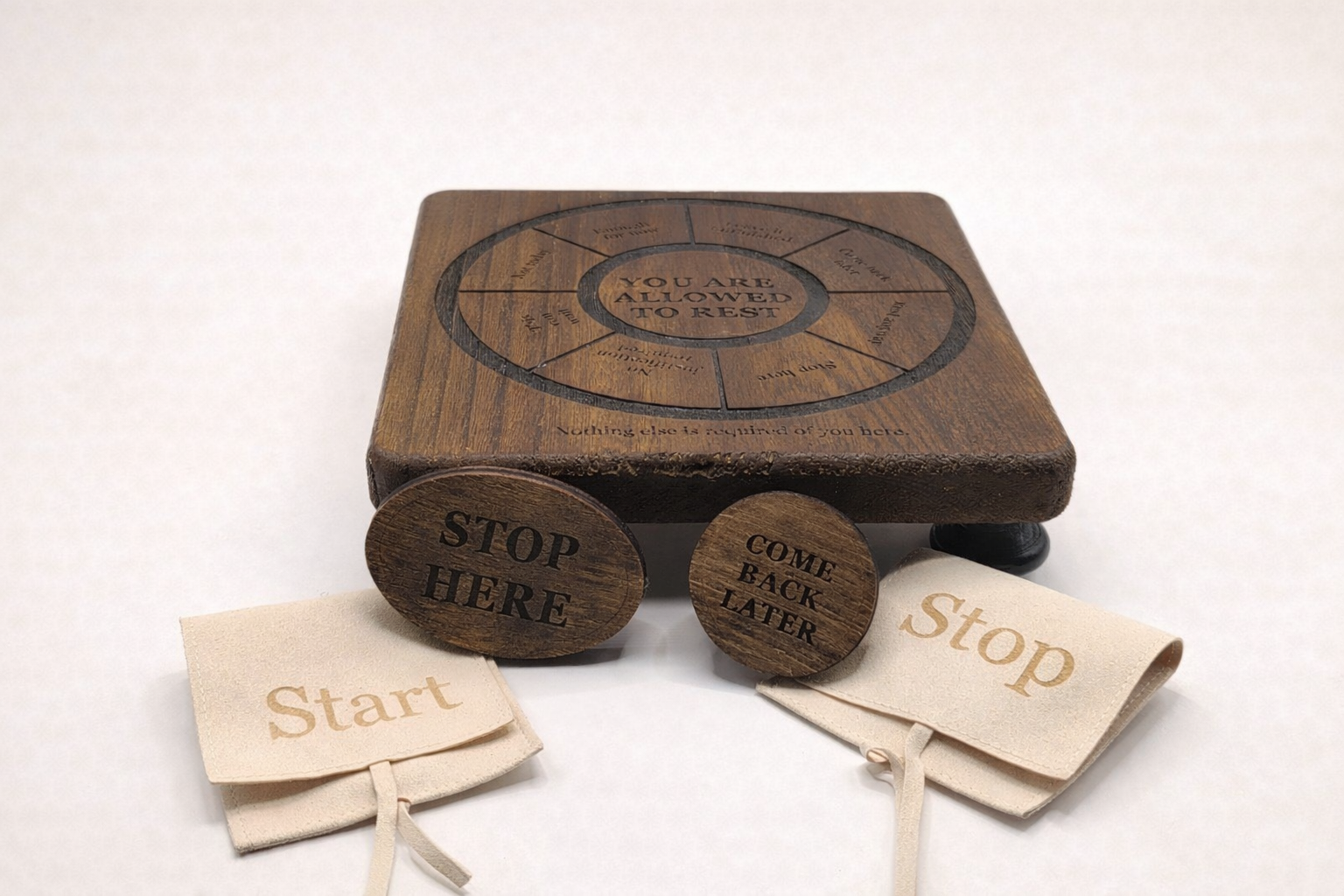 At its center is the You Are Allowed to Rest wooden board, offering quiet permission to stop without expectation. Two wooden tokens, Stop Here and Come Back Later, may be used to name what feels true in the moment.